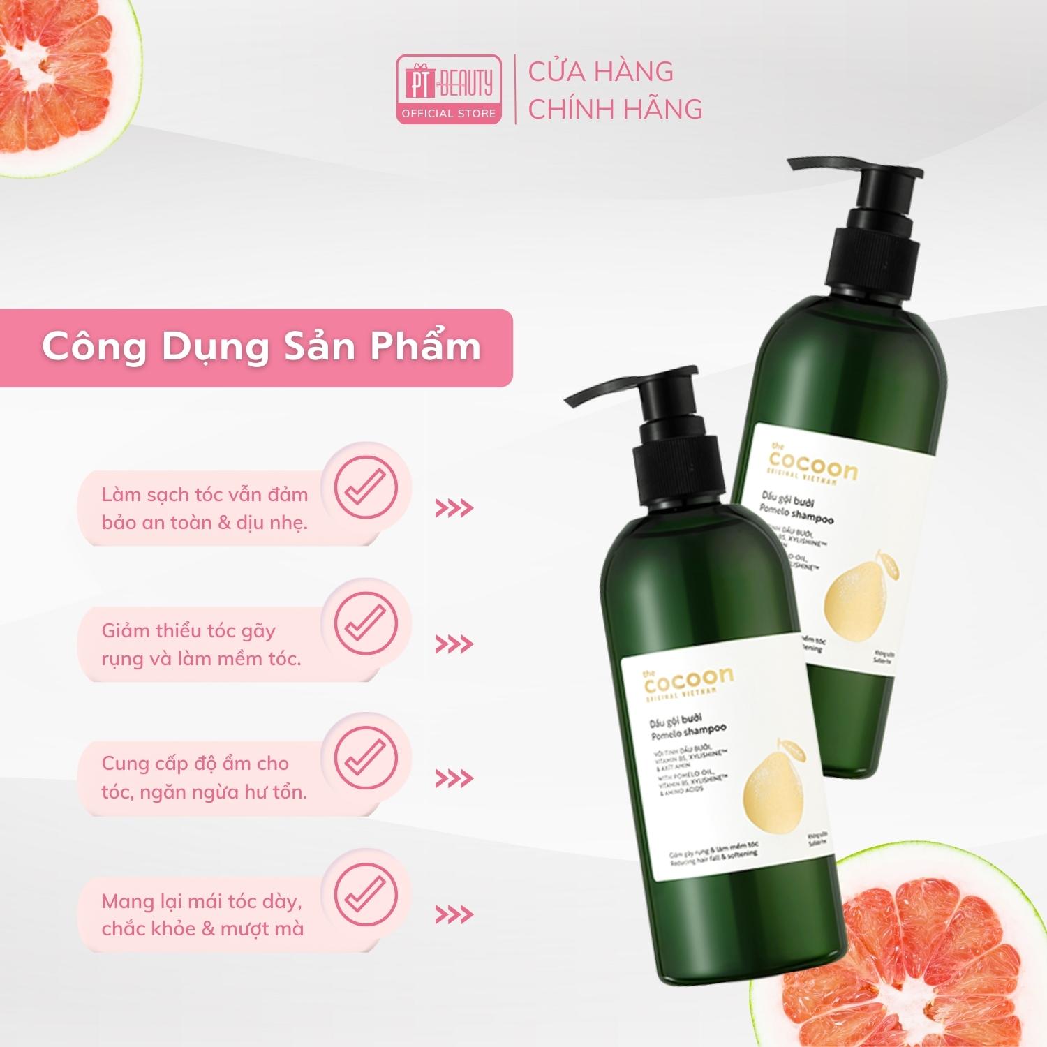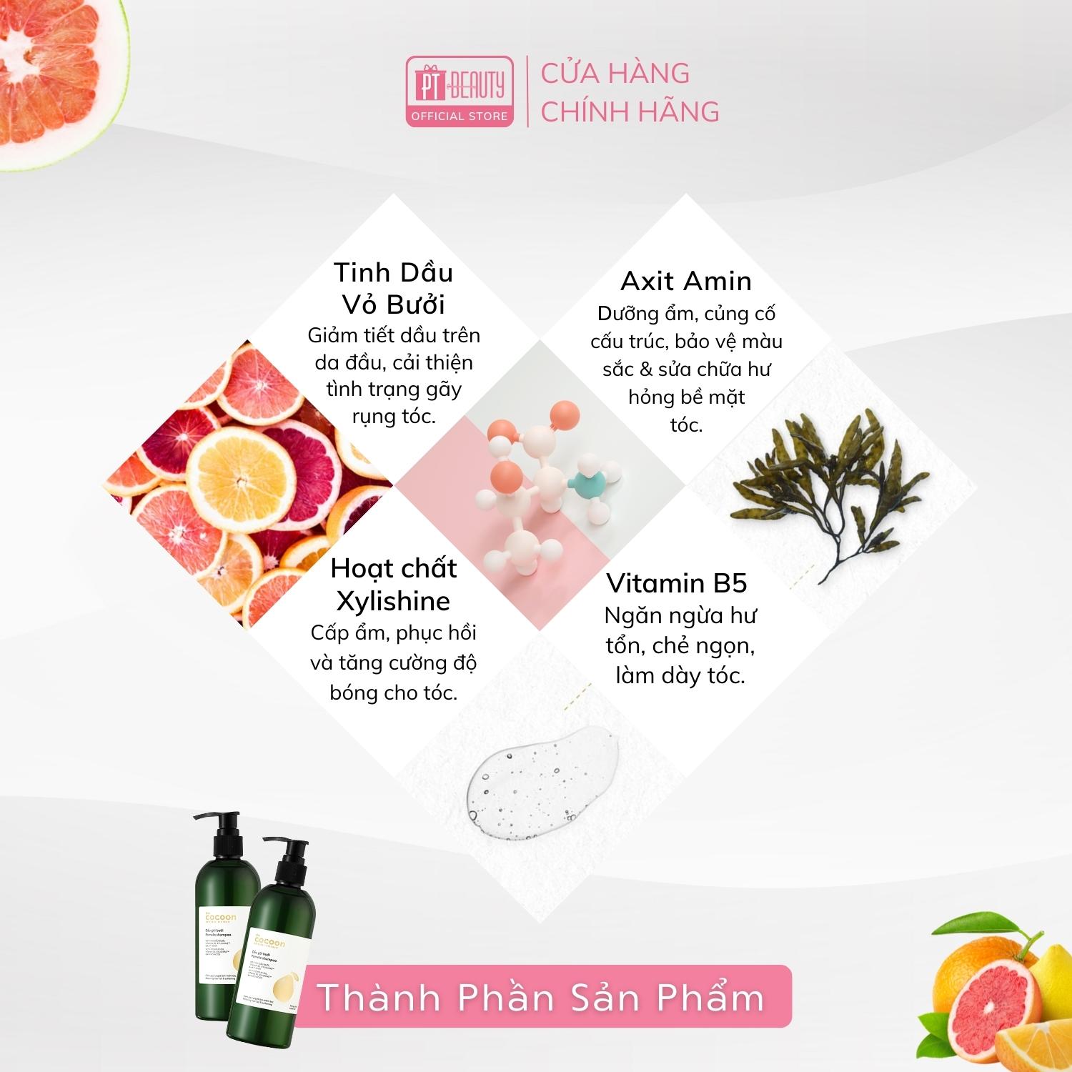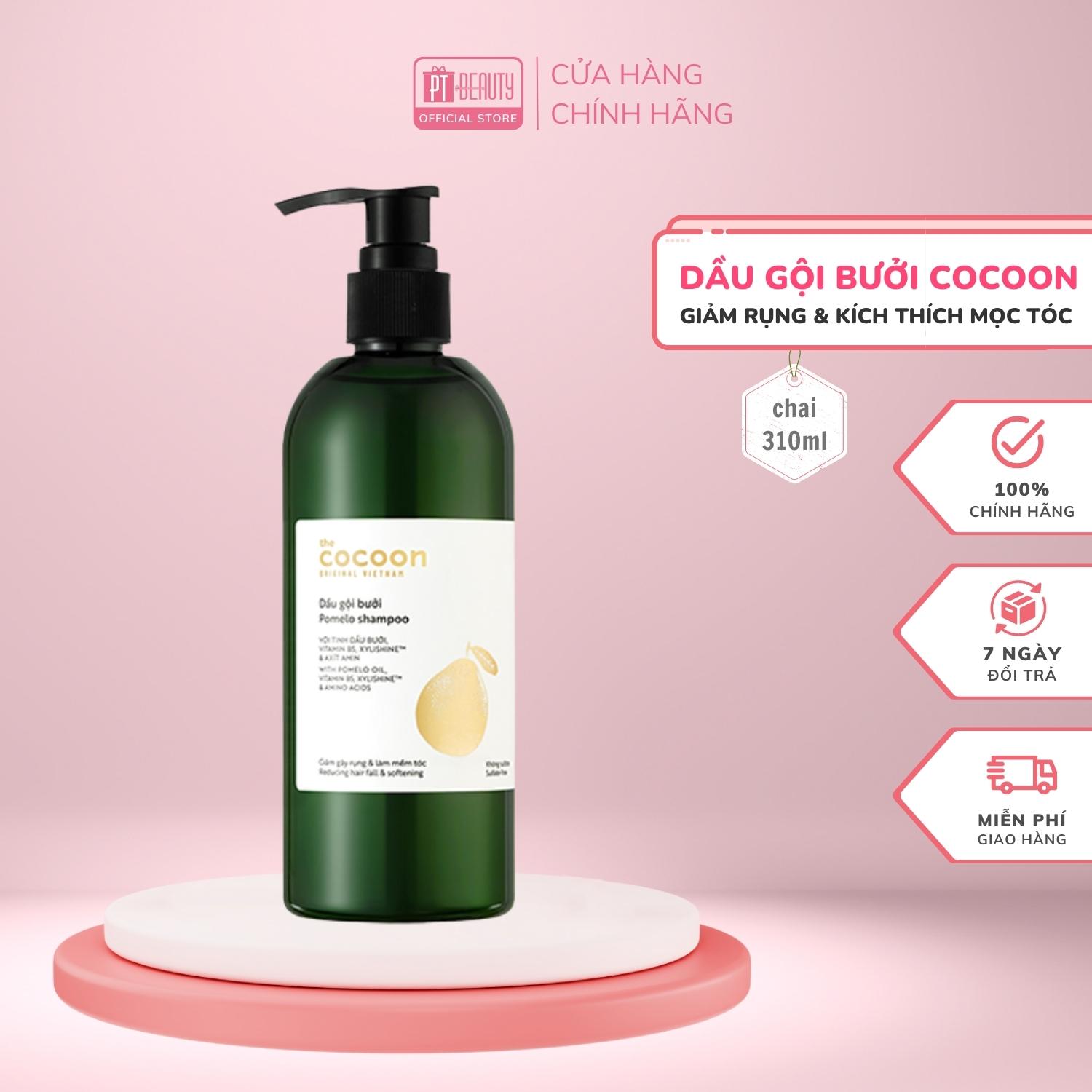 Dầu gội bưởi Cocoon giúp giảm gãy rụng và làm mềm tóc 310ml chiết xuất từ tinh dầu vỏ bưởi Việt Nam truyền thống kết hợp với vitamin B5, hoạt chất dưỡng ẩm Xylishine™ cùng công thức dịu nhẹ không chứa sulfate, dầu gội bưởi giúp làm sạch tóc và giảm gãy rụng, mang lại mái tóc đen dày, chắc khoẻ và mượt mà.