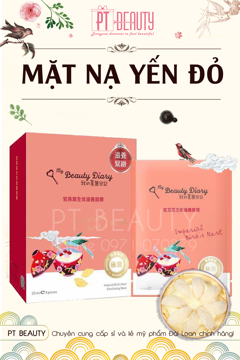 Theo nghiên cứu, threonine có trong tổ yến chính là chất hình thành Elastine và Collagen có tác dụng giúp chống lão hóa, ngăn ngừa vết nhăn, duy trì làn da tươi trẻ và kéo dài nét thanh xuân cho chị em phụ nữ. Vì thế My Beauty Dairy đã cho ra đời mặt nạ Imperial Bird's Nest Nourishing Mask với thành phần chính là có chứa chiết xuất từ tổ yến hoàng gia có khả năng dưỡng ẩm cao, làm dịu da khô nứt nẻ, làm sáng da.
